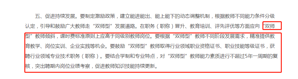 《通知》要求,要鼓勵(lì)“雙師型”教師取得行業(yè)領(lǐng)域職業(yè)資格證書、職業(yè)技能等級(jí)證書,獲聘行業(yè)領(lǐng)域?qū)I(yè)技術(shù)職務(wù)(職稱)。要結(jié)合學(xué)制和專業(yè)特點(diǎn),對(duì)“雙師型”教師能力素質(zhì)進(jìn)行不超過5年一周期的復(fù)核,突出聘期內(nèi)崗位業(yè)績(jī)考察,促進(jìn)教師知識(shí)技能持續(xù)更新。